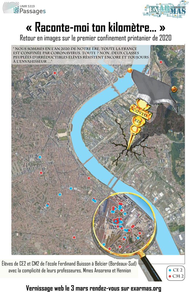 Dans ce cadre nous avons lancé l’appel à création « Raconte-moi ton kilomètre » : pour une redécouverte sensible de nos espaces de grande proximité par temps de confinement [printemps 2020] et nous l’avons ouvert à deux classes de l’école élémentaire Ferdinand Buisson, seule école du vieux Belcier (Bordeaux Sud).