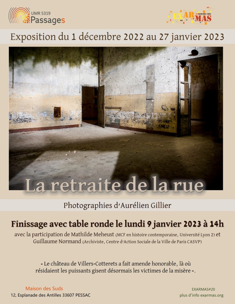 Pour sa vingtième exposition, EXARMAS présente le travail d’Aurelien Gillier autour de sa série de photographies « La retraite de la rue », réalisées en 2014 dans le Château de Villers-Cotterêts. 68 SDF étaient encore hébergés lors du déménagement de l’EHPAD en 2014, et c’est dans ce contexte de transition qu’Aurélien réalise cette série photographique. Cette exposition propose une rencontre et un dialogue avec ce lieu qui illustre un grand nombre des enjeux des changements globaux et recomposition des spatialités.