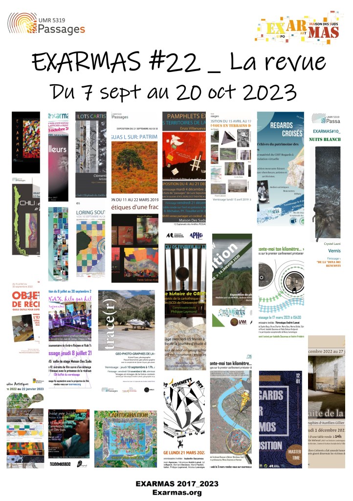 Pour sa vingt-deuxième exposition, EXARMAS présente la revue / rétrospective des 22 expositions réalisées entre 2017 et 2023. En effet, depuis juin 2017, la commission Exarmas a organisé 22 expositions, à la Maison de Suds et hors les murs, et plusieurs manifestations scientifiques ont été presque systématiquement adossées aux vernissages et/ou aux finissages. Ces moments d’échanges sont devenus des espaces de réflexion en phase avec une perspective « art-sciences », et couplés avec des regards géographiques spécifiques (Chili, Afrique du Sud, terrains, kilomètre COVID, montagnes etc.)